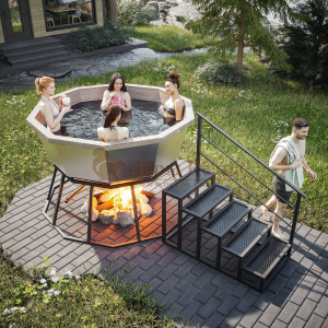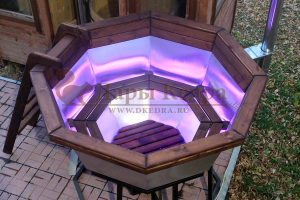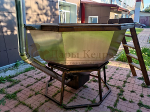 Банный чан на подставке изготовлен из пищевой стали. Представляет собой большую ёмкость в виде чаши, при нагревании которой можно париться на свежем воздухе. Чан установлен на устойчивую металлическую подставку и оборудован кедровым бортом, скамейками, подспинниками, трапом для ног и приставной лестницей. Нагревание банного чана происходит от обычного костра. Если оборудовать данную модель печью, то банные процедуры можно принимать даже зимой.