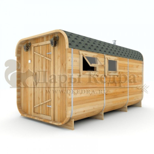 Это прямоугольное изделие с закругленными углами. За счет такой конструкции во время топки воздух циркулирует по кругу, поэтому баня-бочка нагревается не более 30 минут. Баня включает в себя раздевалку, моечную и парную. Во всех трех отделениях лавочки из кедра установлены с обеих сторон. Печь расположена в парилке около дальней стены. Для удобства пользования в бане висят полочки из кедра и вешалка в раздевалке. По вашему желанию баню-бочку квадро можно укомплектовать козырьком, верандой и печью с внешней загрузкой, благодаря которой весь мусор после топки остается на улице. Баня-бочка квадро не требует полноценный фундамент, поэтому при необходимости ее можно перенести в другое место.