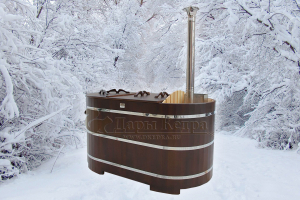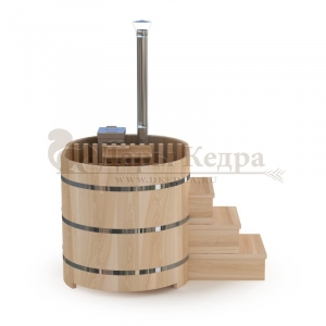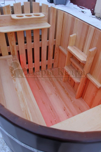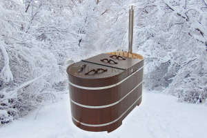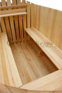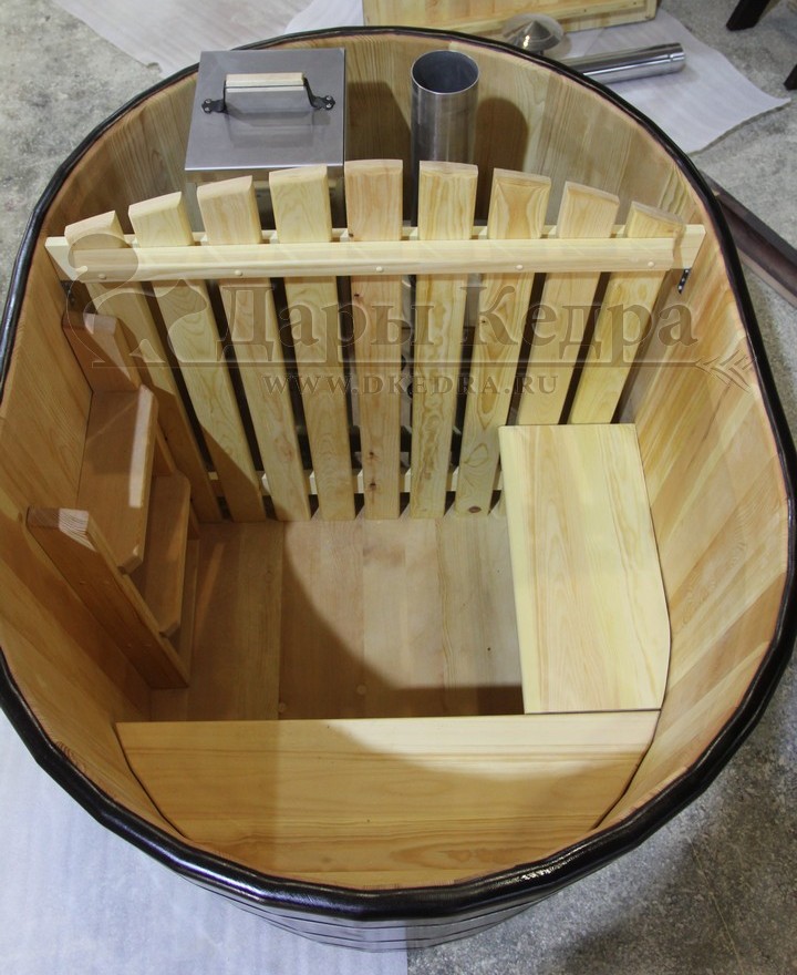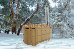 Это уличная баня, которой можно пользоваться круглый год. Купель представляет собой овальную емкость для воды, внутри которой располагаются сиденья из кедра. Нагрев воды происходит за счет встроенной печи, которая находится внутри купели за перегородкой. Рекомендуем приобрести термокрышку и весло для перемешивания воды для ускорения нагрева. Для удобства пользования японская баня фурако оборудована внешней и внутренней лестницей из кедра. В комплектацию этой модели входит совок с длинной ручкой, который позволяет извлекать угли и золу после эксплуатации изделия.
