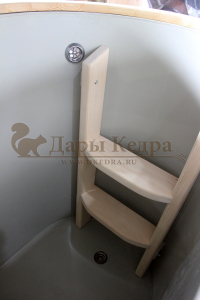 Купель представляет собой две овальные емкости для воды с пластиковыми вставками, в которых люди отдыхают после парения. Между купелями установлен широкий подиум из кедра, по которому могут спускаться и подниматься сразу несколько человек. Для комфортного отдыха купель оснащена лавочками и двумя внутренними лестницами.