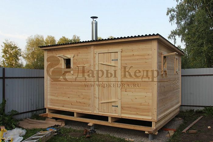 • Металлокаркас на сваях. Такое основание мобильной парной рекомендуется делать там, где грунт нестабильный, выпадает много осадков. При желании снаружи его можно обшить деревом или яхтенной доской.