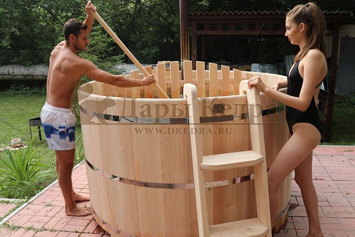 - Главное в уходе за фурако - это следить за положением обручей. Они в любое время года должны быть стянутыми и плотно прилегать к древесине. В случае ослабления или падения их нужно вернуть на место, стянуть. Благодаря этой простой процедуре в дальнейшем не будет проблем с эксплуатацией. Летом купель должна быть постоянно заполнена водой. Если нет возможности наполнить, то рекомендуется налить хотя бы 20-30 см жидкости или поставить таз с водой на дно емкости.